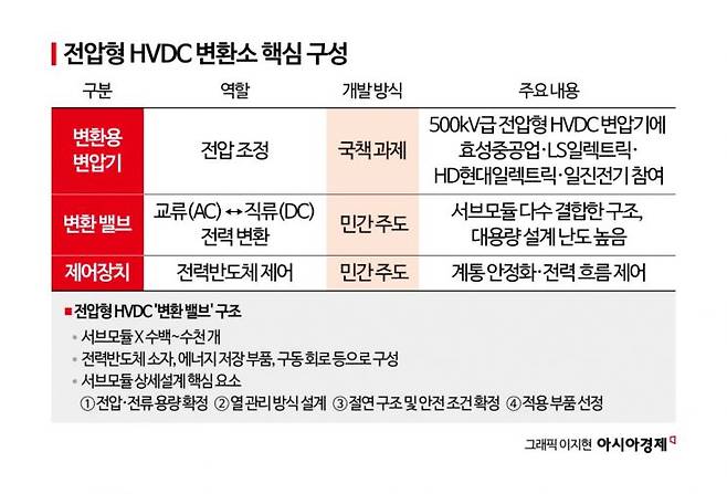 HVDC는 크게 변환용 변압기, 밸브, 제어장치로 구성된다. 변환용 변압기는 전압을 조정하고 밸브는 교류와 직류를 상호 변환하는 전력전자장치다. 제어장치는 밸브 내부 전력반도체의 동작을 제어해 전력 변환 과정을 관리한다. 현재 변압기는 정부 국책과제로 효성중공업을 비롯한 국내 전력4사가 각각 개발하고 있고 밸브와 제어장치는 각 기업이 개발을 주도하는 민간방식이다.