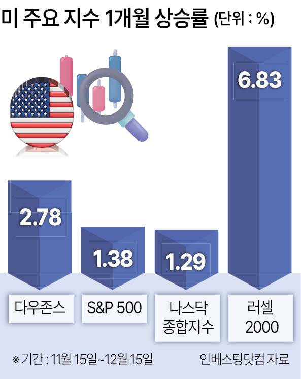 이날 인베스팅닷컴에 따르면 중·소형주 중심의 러셀2000 지수는 최근 한 달 새(11월 13일~12월 13일) 6.83% 상승했다. 같은 기간 나스닥종합지수는 1.29%, 스탠더드앤드푸어스(S&P)500지수는 1.38% 오르는 데 그쳤다. 경기민감주 비중이 높은 다우존스30산업평균지수도 2.78% 상승했다. 대형 AI주를 제외한 중·소형주와 경기민감 업종 전반으로 자금이 분산되고 있는 흐름으로 해석된다.