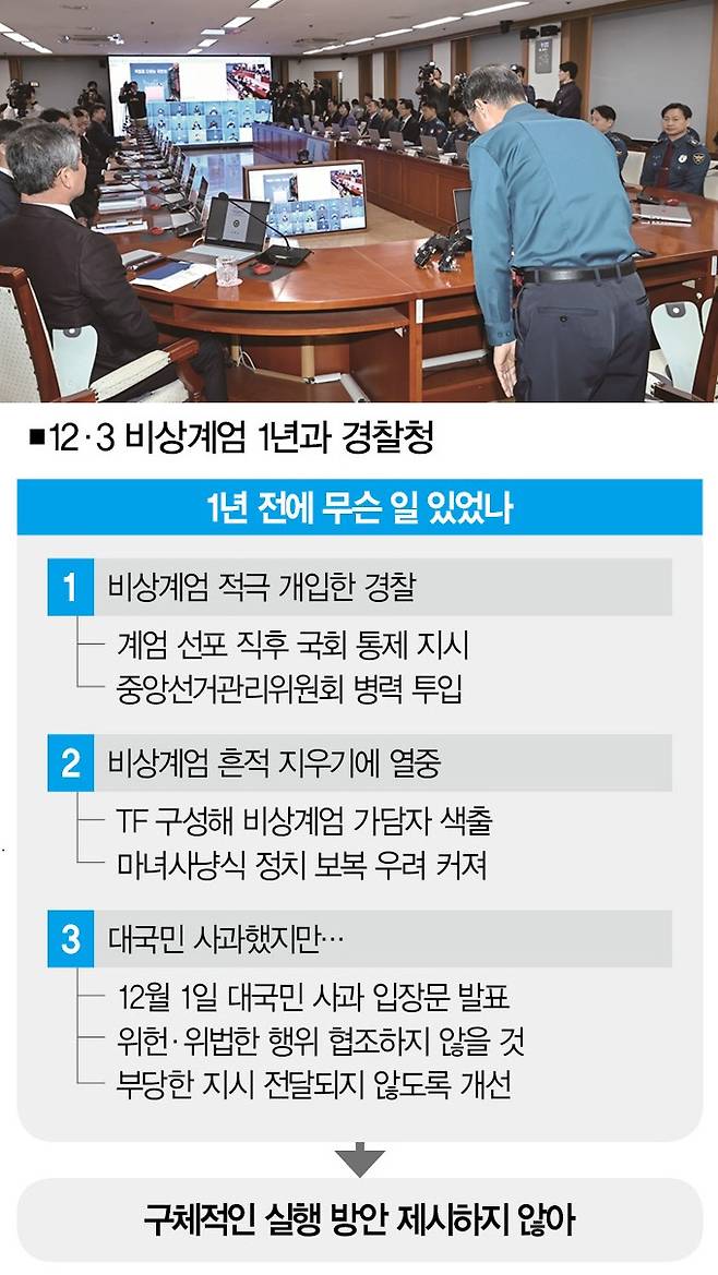 ■ 비상계엄 1년 後 = 경찰 서열 1·2위의 구속에도 아무런 입장을 밝히지 않던 경찰이 국민 앞에 고개를 숙인 건 계엄이 터진 지 1년이나 흐른 1일이었다. 유재성 경찰청장 직무대행은 이날 열린 전국 경찰 지휘부 화상회의에 앞서 대국민 사과 입장문을 발표했다.