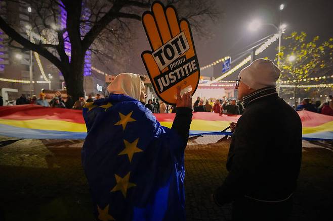 [부쿠레슈티=AP/뉴시스] 14일(현지 시간) 루마니아 부쿠레슈티에서 현지 언론의 조사 보도로 사법부 내 고위급 정치 개입과 부패 의혹이 제기된 가운데, 사법 제도 개혁을 요구하는 시위대가 루마니아 국기와 사법 정의를 요구하는 팻말을 들고 행진하고 있다. 2025.12.15.
