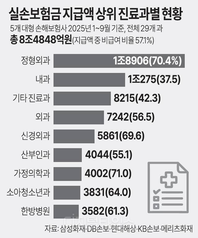 올해 실손보험금 지급액 증가세 역시 가파르다. 대형 손보사 5곳(삼성화재·DB손해보험·현대해상·KB손해보험·메리츠화재)의 올 9월 누적 실손보험금 지급액은 8조4848억원으로 전년 동기 대비 13.1% 증가했다. 실손보험금은 2021년부터 지난해까지 연평균 7.6% 늘었는데 올해는 더 빠른 속도로 증가하고 있다.