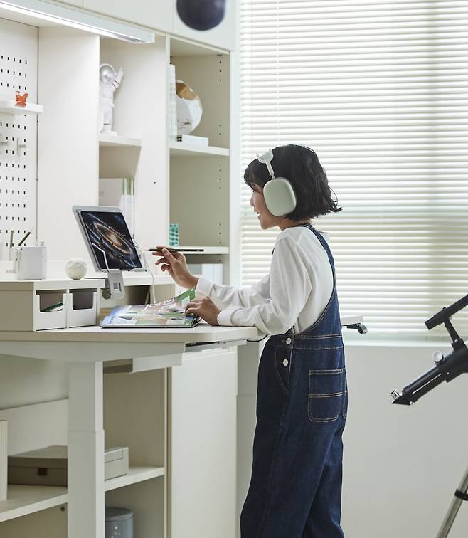 전동 높낮이 조절 기능을 갖춘 '조이S 2 모션데스크'는 초등 저학년부터 고학년까지 성장에 따라 자연스럽게 높이 조절이 가능해 바른 자세 습관 형성에 도움이 된다. 책상 전면의 원형 컨트롤러로 앉은 상태에서도 쉽게 조작할 수 있으며, 넉넉한 수납 공간은 아이가 스스로 정리하는 습관을 만드는 데 용이하다.