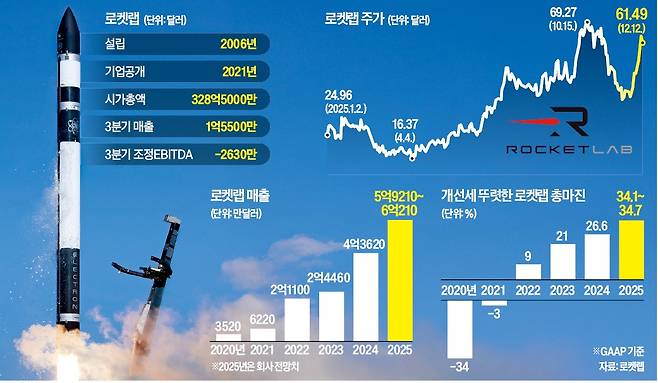 주가가 급등한 배경에는 실적이 있다. 로켓랩은 올해 3분기 창사 이후 최대 실적을 기록했다. 매출은 전년 동기 대비 48% 급증한 1억5500만달러를 기록했다. 일반회계원칙(GAAP) 기준 총마진은 2020년 -34%, 지난해 26.6%에서 올 3분기 37%로 높아졌다. 3분기 발사 부문 수주 잔액은 5억970만달러로 전년 동기 대비 56% 증가했다. 수주 잔액의 상당 부분은 미국 정부·국방 프로젝트 관련 계약인 것으로 알려졌다. 로켓랩은 “올해 들어 16건의 발사가 모두 성공했고, 연내 네 건 이상을 추가 발사할 계획”이라며 “미국 항공우주국(NASA), 전쟁부 산하 기관과의 협력도 이어지고 있다”고 밝혔다.