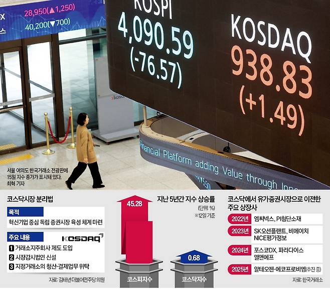 여당이 코스닥시장 분리·독립 카드를 꺼내든 것은 자본시장의 ‘만년 2부리그’로 전락한 코스닥을 활성화하려는 포석이다. 내년에 출범 30주년을 맞는 코스닥은 기술력을 갖춘 벤처기업 성장의 마중물로 자리매김한다는 취지로 문을 열었지만 개인투자자의 ‘단타 투기판’으로 변질됐다는 지적이 끊이지 않았다. 코스닥시장이 독립적으로 운영되면 경쟁을 통해 시장 효율성이 높아져 혁신 촉진과 자본 회수라는 본연의 기능이 강화될 것이란 기대가 작지 않다.