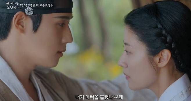 무엇보다 두 사람이 주고받는 달달한 눈맞춤은 핑크빛 분위기를 한층 더 깊게 물들이며 보는 이들의 마음까지 흔들어놓았다. 훔치다 못해 이열의 마음까지 빼앗아버린 도적 홍은조는 은은한 미소로 그를 바라보고 이열은 그런 홍은조에게 한 치의 망설임도 없이 직진하겠다는 듯 깊은 멜로 눈빛을 건네 미소를 자아냈다.