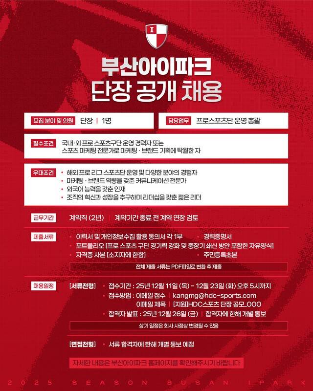 K-단장직 '오피셜' 채용 D-8 남았다... '회장님 구단' 2부 부산, 팀 혁신-성장 이끌 단장 공개 채용