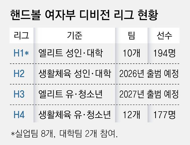 올해 H1과 H4 리그만 운영한 대한핸드볼협회는 내년에는 생활체육 대학·성인 선수가 참가하는 H2, 2027년에는 엘리트 유·청소년이 참가하는 H3 리그도 도입할 예정이다. 협회 관계자는 “현실적으로 프로축구 같은 승강제 도입은 당장 어렵다. 하지만 리그 규모 확대를 원하는 현장 목소리를 반영해 점차 경기, 참가 팀 수를 늘려 나갈 계획”이라고 말했다.