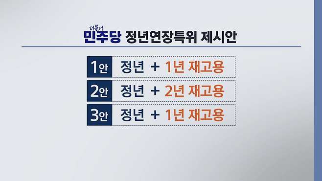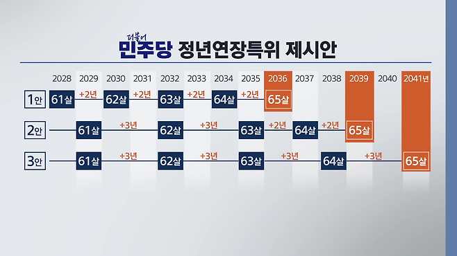 민주당이 제시한 1안은 2028년부터 2년마다 한 살씩, 2안은 2029년부터 2~3년마다 한 살씩, 3안은 2029년부터 3년마다 한 살씩 정년을 늘리는 방안인데요.