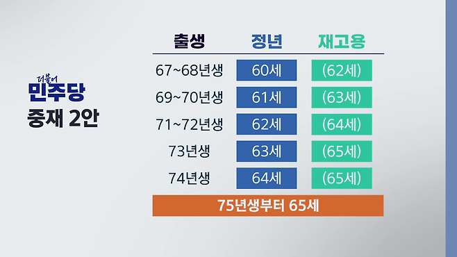 민주당은 이미 3개의 중재안을 내놨습니다. ' 정년 65세'를 어느 정도 속도로 추진할지 3가지 시나리오를 만들고, 노사 의견을 들었습니다.
