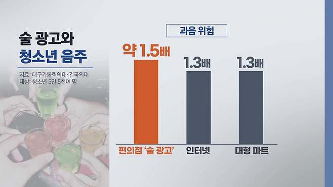 그 결과, 편의점 술 광고에 노출된 청소년은 과음 위험이 그렇지 않은 청소년보다 약 1.5배 높았습니다.