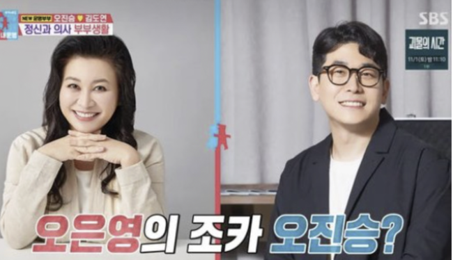 15일 방송된 SBS 예능 프로그램 ‘너는 내 운명-동상이몽2’에서는 오진승과 김도연 부부가 동문 선후배 사이인 부부 상담 전문의를 찾아가는 모습이 그려졌다. 평소 청년 우울을 주로 다뤄온 오진승과 달리, 해당 전문의는 부부 상담을 전문으로 하는 후배였다.“본인 진단은 못 내리느냐”는 질문에 오진승은 “부부 관계이기 때문에 스스로 진단할 수 없고, 부부 상담은 내 전문 분야가 아니다”라고 답했다. 김구라는 “아내가 기본적으로 남편을 크게 신뢰하지 않는다”고 농담을 던지며 분위기를 풀었다.