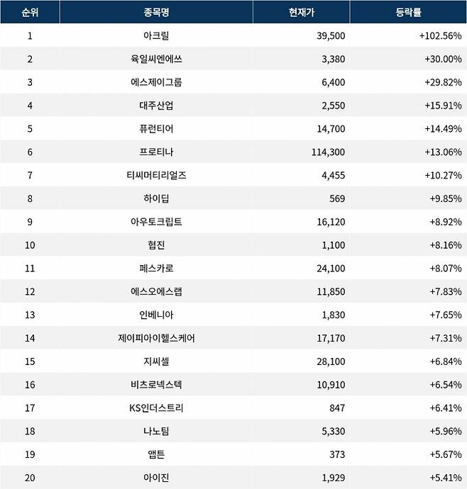 6위 프로티나(468530)는 현재가 11만 4300원으로 13.06% 상승 중이다. 7위 티씨머티리얼즈(125020)는 현재가 4455원으로 10.27% 상승 중이다. 8위 하이딥(365590)은 현재가 569원으로 9.85% 상승 중이다. 9위 아우토크립트(331740)는 현재가 1만 6120원으로 8.92% 상승 중이다. 10위 협진(138360)은 현재가 1100원으로 8.16% 상승 중이다.