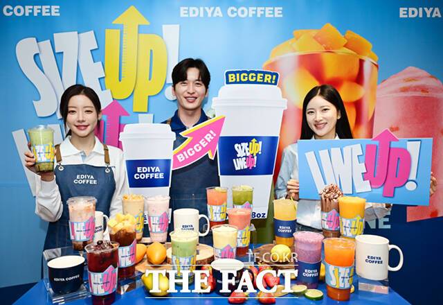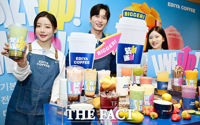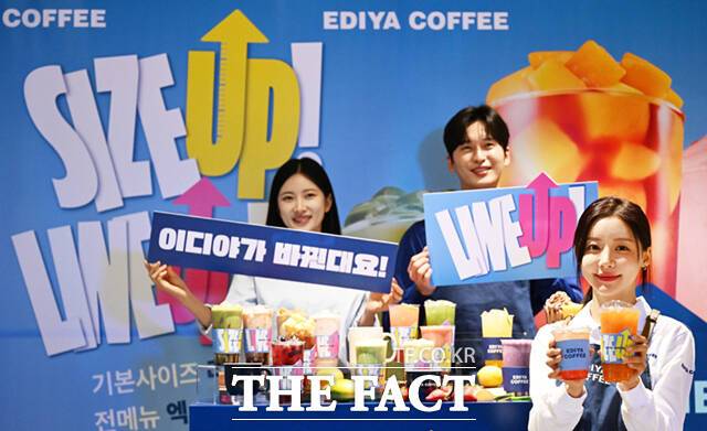 [더팩트ㅣ이새롬 기자] 이디야커피가 16일 서울 중구 이디야커피 매장에서 음료 용량 확대 및 메뉴 라인업 개편을 알리는 'SIZE UP & LINE UP' 행사를 연 가운데, 모델들이 제품을 선보이고 있다.