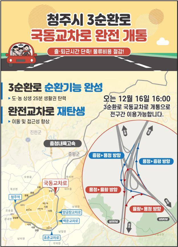 청주시와 대전지방국토관리청은 총사업비 150억 원을 들여 착공 1년 8개월 만인 오늘(16) 충청내륙로와 3순환로의 모든 방향을 잇는 국동교차로 연결로를 개통합니다.