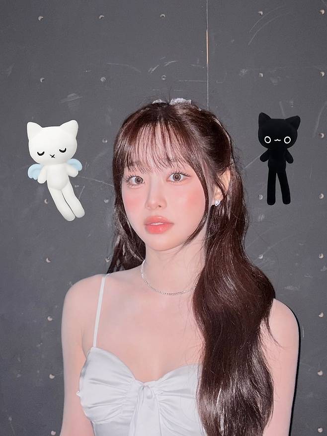 귀여운 캐릭터 이모티콘이 더해진 정면 셀카 컷에서는 또렷한 눈매와 동그래진 눈동자가 강조돼, 마치 애니메이션 속에서 막 튀어나온 캐릭터 같은 비현실적인 비주얼을 자랑했다.