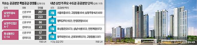 수도권 3기 신도시 중 규모가 가장 큰 경기 남양주 왕숙지구 청약에서 최근 처음으로 세 자릿수 경쟁률이 나왔다. 사전청약 신청자 이탈로 분양 물량이 늘었지만 젊은 실수요자가 몰리며 공공분양 단지마다 경쟁률이 뛰고 있다. 수도권 내 민간 공급은 줄고 분양가가 치솟는 데 따른 반사작용이란 분석이 나온다. 정부는 공공분양 수요가 많다는 판단 아래 내년 수도권 주요 입지에 2만9000가구를 분양할 계획이다.