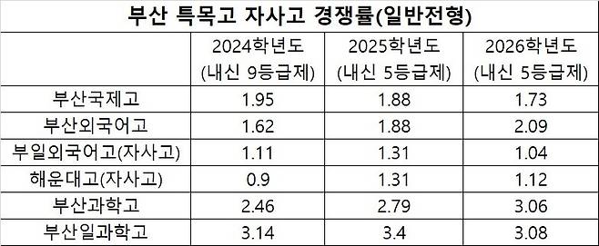 부산외국어고는 일반전형 경쟁률이 16년 만에 2대1을 넘었다. 5개 학과(일본·중국·프랑스·독일·스페인어) 200명 모집에 417명이 지원해 2.09 대 1의 경쟁률을 보였다. 이 학교의 일반전형 기준 경쟁률이 2 대1 을 넘은 것은 2010학년도다. 당시 2.52 대 1을 기록했다. 이 학교의 일반전형 경쟁률은 전국 단위 모집을 했던 2009년까지 4 대 1을 넘었다가 2010학년도부터 부산권 중학생만 모집하면서 하락하기 시작했다. 지금의 자기주도학습전형이 도입된 2011학년도부터 경쟁률이 급락하기 시작했다. 당시 일반전형이 1.25 대 1을 기록했다. 자기주도학습전형은 공인인증시험 성적이나 경시대회 실적을 반영하지 않고 내신성적과 면접만으로 학생을 뽑는 것이다. 이 학교 일반전형은 2022학년도엔 1.01 대 1을 기록하며 겨우 미달을 모면했다. 마지막 내신 9등급 세대(현 고2)를 선발한 2024학년도엔 1.62 대 1을 기록했다. 고교학점제 1세대(현 고1)를 선발한 2025학년도엔 1.88 대 1로 상승했고 2026학년도에 2.09 대 1을 기록했다.