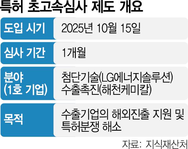 지식재산처가 국내 기업의 해외 수출 지원을 위해 도입한 ‘특허 초고속심사’ 제도의 1호 기업이 탄생했다. LG에너지솔루션(373220)과 해천케미칼이 그 주인공이다. 두 기업은 신속하게 확보한 특허를 바탕으로 글로벌 시장에서 기술 경쟁력을 강화하고 수출 확대에도 속도를 낼 수 있을 것으로 기대된다.