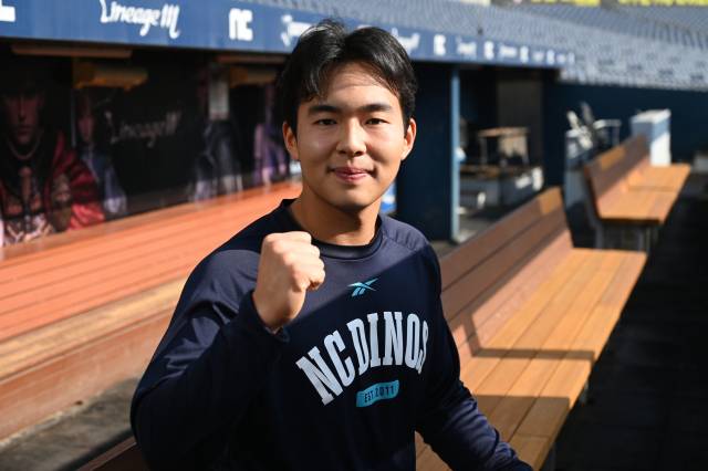 NC다이노스 김휘집이 16일 창원NC파크에서 경남신문과 인터뷰를 마치고 포즈를 취하고 있다.