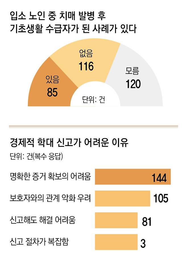 그 결과, 곳곳에서 치매 노인이 자산을 뺏기고 방치되는 징후가 뚜렷했다. 설문에 응답한 시설 중 54곳(16.8%)은 “가족이나 지인에게 금융 범죄 피해를 본 치매 노인 사례를 직접 목격했거나 알고 있다”고 답했다. 구체적인 징후도 뚜렷했다. “입소 이후 노인의 자산이 급격히 감소한 경우가 있다”고 답한 곳은 33곳(10.3%)이었다. 멀쩡하던 노인이 치매 발병 후 빈털터리가 되어 “기초생활 수급자로 전락했다”는 응답도 85곳(26.5%)에 달했다. 시설 입소 노인 약 10명 중 3명은 치매가 온 뒤 평생 모은 재산을 잃고 국가의 지원에 의존하게 된 것이다.