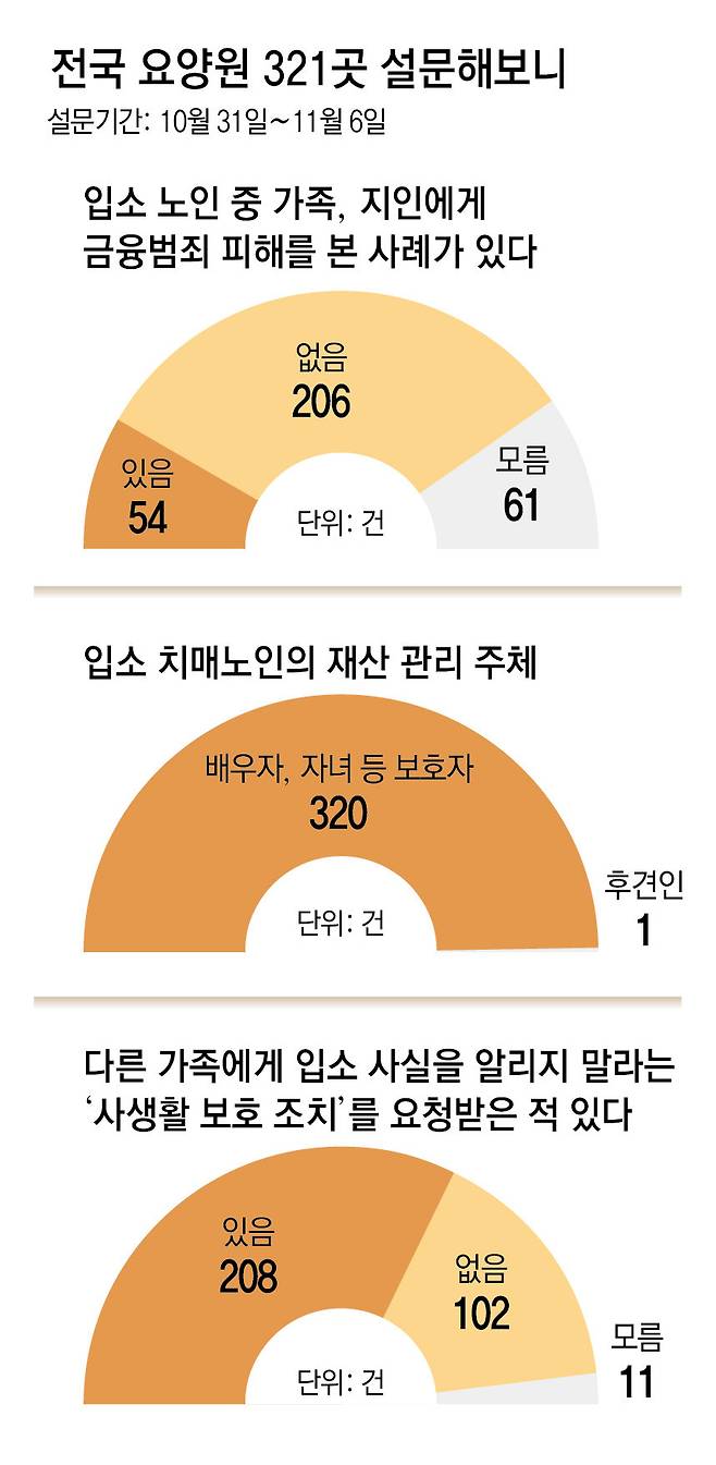 이들처럼 새어 나가는 기억과 재산을 붙잡지 못하고 있는 ‘치매 머니 사냥’의 피해자는 전국 요양시설에 얼마나 퍼져 있을까. 동아일보 히어로콘텐츠팀이 10월 31일부터 지난달 6일까지 한국노인장기요양기관협회와 함께 전국 요양원 321곳을 대상으로 심층 설문조사를 벌였다.