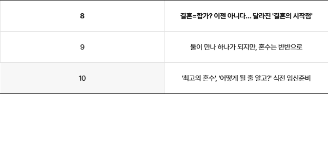 기성 세대에게는 안드로메다 문화처럼 어색한 밀레니얼 세대의 이성관과 결혼관. 그들의 고민을 '결준'(결혼준비)부터 '돌끝'(아이의 첫 돌이 끝나는)까지 단계별로 소개합니다. 당사자 인터뷰와 SNS 갈무리한 내용과 함께 전문가의 관련 제언도 따라갑니다.
