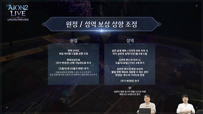 성역에서는 보스 처치 보상이 전면 상향됐다. '심연의 날개 케투', '이격의 라후' 처치 시 심연의 상자 획득량이 증가했으며 '영겁의 루드라' 처치 보상에 조율석이 추가됐다. 또한 루드라 장비 변경권을 활용해 원하는 심연 재련 장비를 선택 제작할 수 있도록 개선됐다.