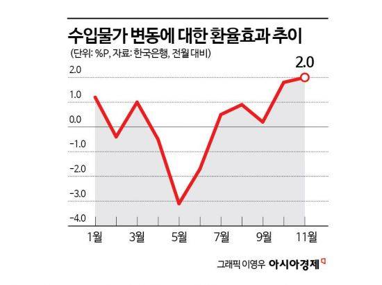 환율이 수입 물가에 미치는 영향은 지난 10월부터 큰 폭으로 확대되기 시작해 11월에 올해 들어 가장 컸다.