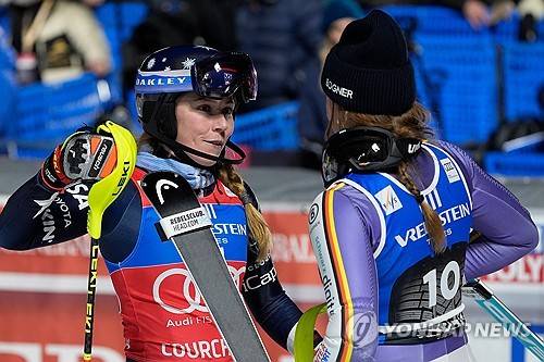 United States' Mikaela Shiffrin, left, winner of an alpine ski, women's World Cup slalom, and Germany's Emma Aicher, third-placed, congratulate each other at the finish area, in Courchevel, France, Tuesday, Dec. 16, 2025. (AP Photo/Giovanni Auletta)