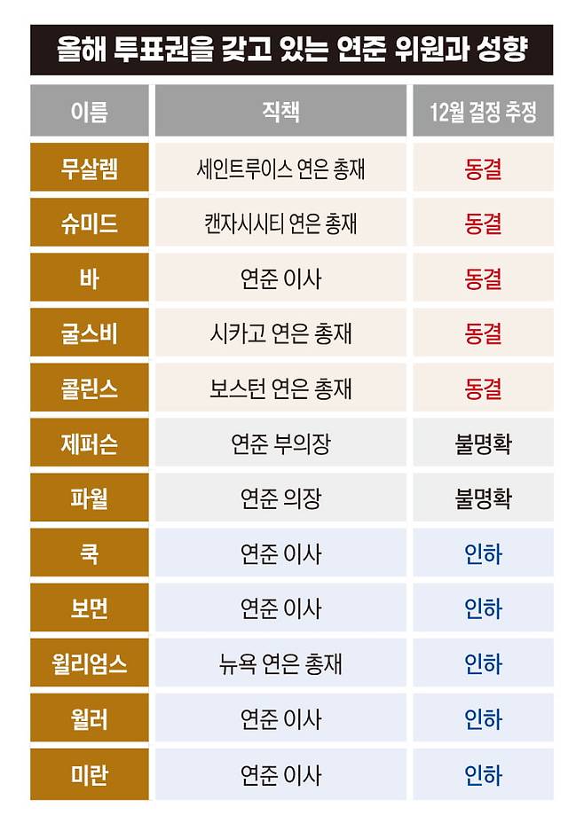 12월 FOMC에서 투표권을 갖는 12명의 위원 중 5명(알베르토 무살렘 세인트루이스, 제프리 슈미드 캔자시스티 , 오스탄 굴스비 시카고, 수잰 콜린스 보스턴, 마이클 바)은 12월에 기준금리를 동결해야 한다고 주장하고 있다.