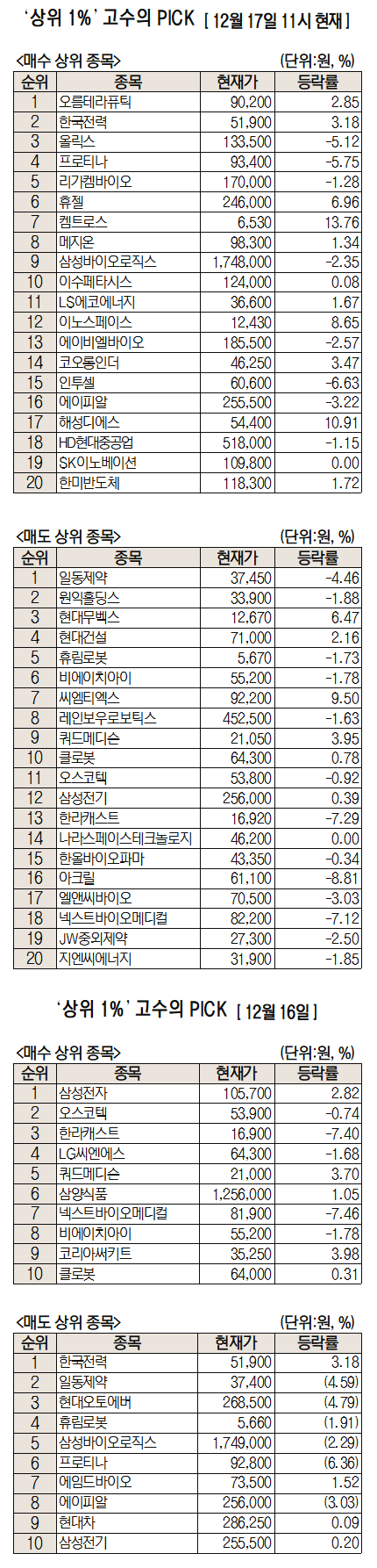 미래에셋증권은 자사 고객 중에서 지난 1개월간 수익률 상위 1% 투자자들의 매매 종목을 집계해 실시간·전일·최근 5일 기준으로 모바일트레이딩시스템(MTS) 상에서 공개하고 있다. 이 통계 데이터는 미래에셋증권의 의견과 무관한 단순 정보 안내이며 각각의 투자자 개인에게 맞는 투자 또는 수익 달성을 보장하지 않는다. 또 테마주 관련 종목은 이상 급등락 가능성이 있으므로 유의해야 한다.