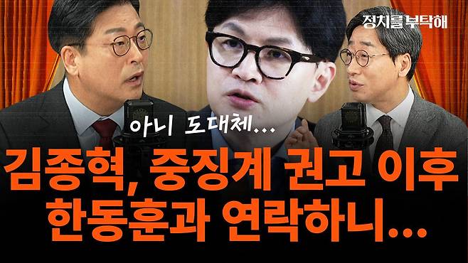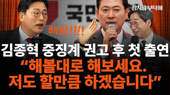 ▷ 권오혁: 많이 기다려 주셨습니다. 오늘 김종혁 전 국민의힘 최고위원 김성완 시사평론가님 모셨습니다. 안녕하세요. 아무래도 오늘 김종혁 최고원님께 드릴 질문이 좀 많을 것 같습니다. 굉장히 어떻게 보면 화제의 인물이시고 지금 굉장히 중심에 있으신 분이 오늘 고정이신데 사실 딱 타이밍에 맞게 저희 모시게 됐는데.