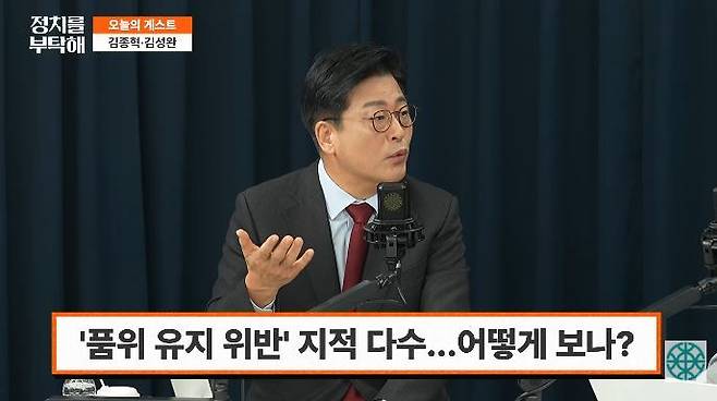 ▶ 김성완: 근데 말씀하실 때 굉장히 불안해요. 왜냐하면 아직까지 윤리위 결정이 안 난 상황인데 윤리위원장 임명되면 당무위 당원권 정지 2년 징계를 권고받고도 나가가지고 이런 얘기를 하더라 그래가지고 진짜 나중에 출당이나 제명 조치 나올까 봐 걱정이 될 지경이에요.