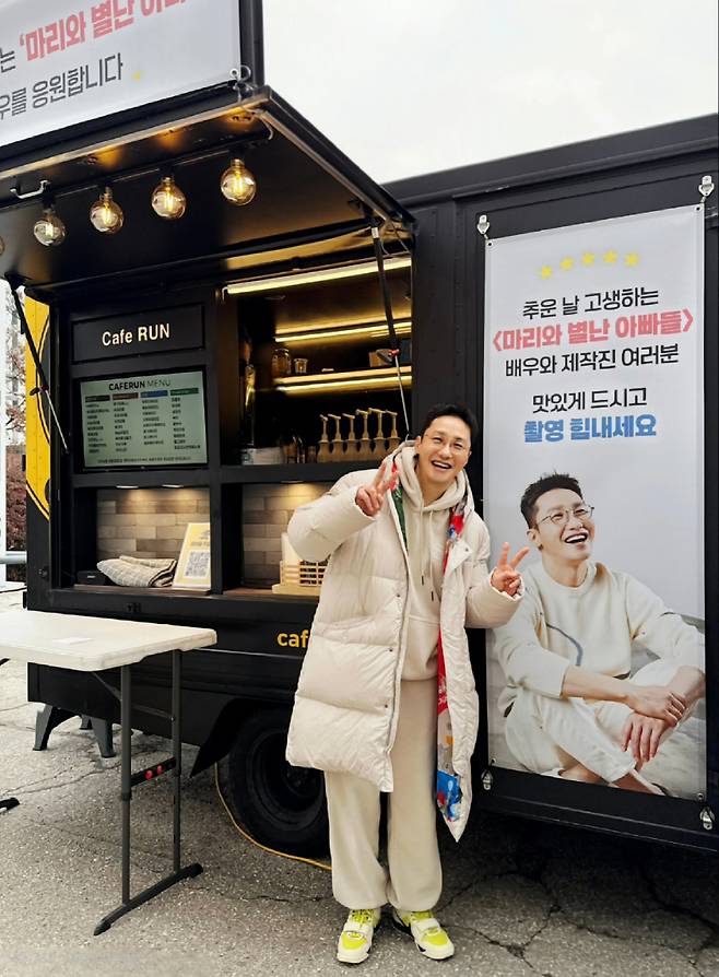 친구들의 응원이 담긴 커피차에 황동주는 KBS 1TV '마리와 별난 아빠들'에 함께 출연하고 있는 배우 류진, 그리고 현우와 장난스런 포즈로 인증샷을 남기며 시선을 사로잡았다.