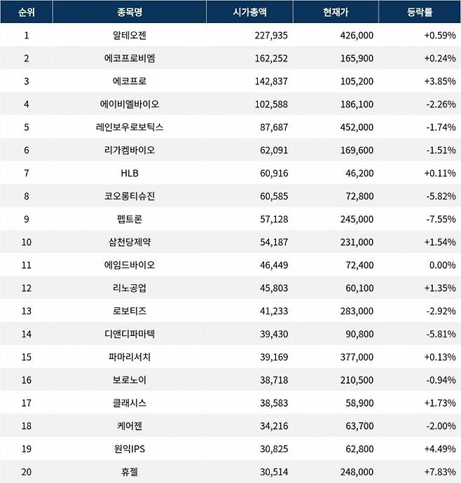 17일 한국거래소에 따르면, 시가총액 1위인 알테오젠(196170)은 현재가 426,000원으로 전 거래일 대비 0.59% 상승하고 있으며, 시가총액 227,935억원, 외국인비율 14.08%, 거래량 408,582주를 기록하고 있다. PER은 181.43배, ROE는 29.52%다. 시가총액 2위인 에코프로비엠(247540)은 165,900원으로 0.24% 상승했으며, 시가총액은 162,252억원이다. 외국인비율은 12.39%, 거래량은 288,141주로, PER은 5,184.38배, ROE는 -6.26%다.