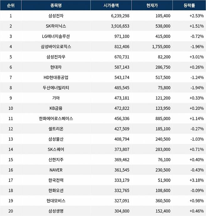 한편 시가총액 20위권 종목들은 한화에어로스페이스(012450) ▲1.14%, 셀트리온(068270) ▼0.27%, 삼성물산(028260) ▼1.03%, SK스퀘어(402340) ▲0.71%, 신한지주(055550) ▲0.40%, NAVER(035420) ▼0.43%, 한국전력(015760) ▲3.18%, 한화오션(042660) ▼0.09%, 현대모비스(012330) ▲0.98%, 삼성생명(032830) ▲0.46% 등의 성적을 기록하고 있다.