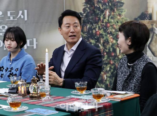 오세훈 서울시장이 17일 오후 관악구 성민종합사회복지관 내 '서울마음편의점'을 방문해 봉사자들과 '외로움없는 서울 프로젝트' 1주년 기념 간담회를 갖고 있다.