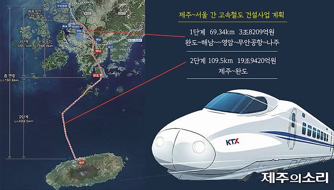 완도에서 제주로 이어지는 해저터널은 2단계 사업으로 구분했다. 해저 고속철도 길이는 109.5km이다. 이에 필요한 공사비는 19조9420억원으로 예측됐다.