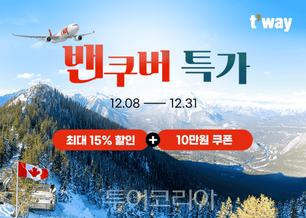티웨이항공은 국내 LCC 중 유일하게 운항 중인 인천–밴쿠버 노선을 대상으로 최대 15% 할인 프로모션을 진행한다. 할인 코드와 추가 쿠폰을 활용하면 편도 30만 원대로 캐나다 서부 여행이 가능해진다.