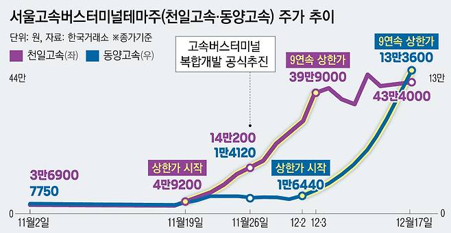 두 회사가 잇단 상한가를 기록한 것은 지난달 서울시가 발표한 서초구 고속터미널 재개발 추진 소식이 발표된 영향이다. 천일고속은 고속터미널 지분 16.67%를 보유한 2대주주이고, 동양고속은 지분 0.17%를 보유한 고속터미널 3대 주주다.