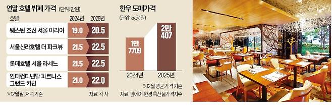 연말이 다가오면서 음식점 등 송년회 관련 물가가 줄줄이 오르고 있다. 특급 호텔 뷔페는 1인 20만원을 넘어 30만원도 넘본다. 한우값은 작년보다 15% 이상 뛰었다.