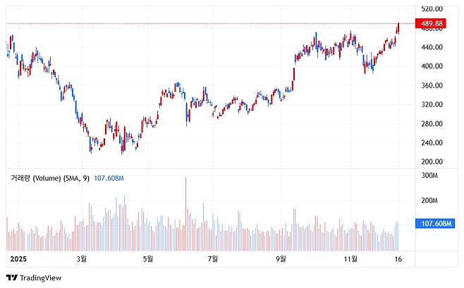 미국 현지시간으로 16일 미국 증시에서 테슬라 주가는 489.88달러로 마감해 2024년 12월 17일 이후 처음으로 최고치를 기록했다. 또 장중 최고가는 191.50달러로 사상 처음 490달러를 돌파했다. 17일(현지시간) 미국 증시 개장전 프리마켓에서도 테슬라 주가는 상승세를 이어가 0.5% 상승한 492달러에 거래중이다. 테슬라는 지난 주 목요일 이후 5거래일째 상승세를 보이고 있다.