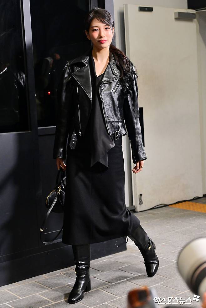 블랙 원피스로 깊지 않게 파인 넥라인과 자연스럽게 흐르는 실루엣은 수지 특유의 청초한 이미지를 해치지 않으면서도 성숙한 무드를 더한다. 발목부터 종아리까지 부드럽게 감싼 블랙 롱부츠로 세련된 실루엣을 완성했다. 과한 장식 없이 미니멀한 디자인을 선택해 전체 스타일의 흐름을 해치지 않는 점이 인상적이다. 레더 재킷과의 소재 통일감도 돋보인다.