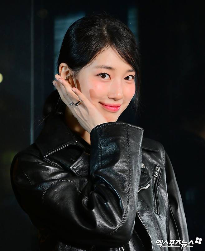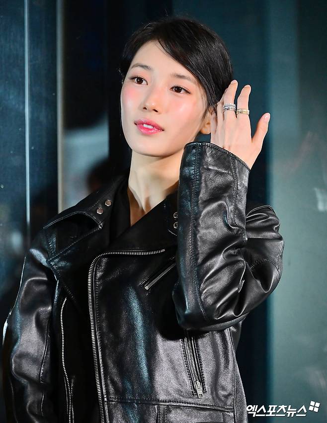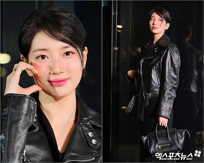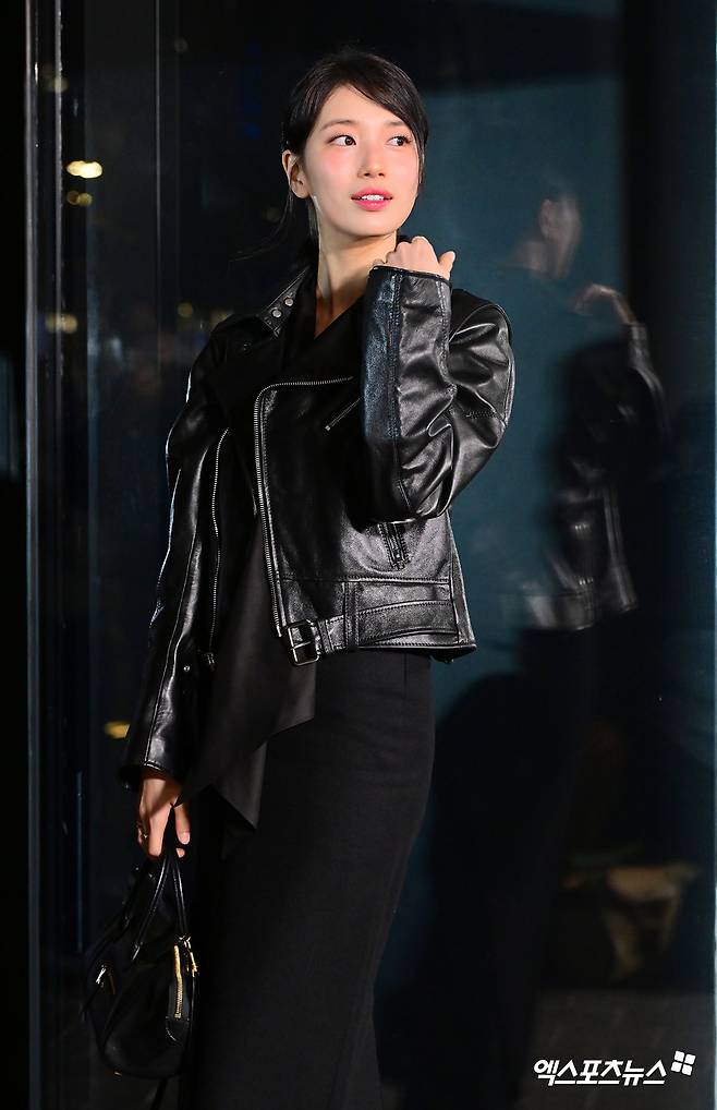이날 행사에 참여한 수지는 블랙 가죽 자켓에 클래식한 더블 버튼 디자인에 은은한 광택이 더해져, 강인함과 세련미를 동시에 담아냈다.