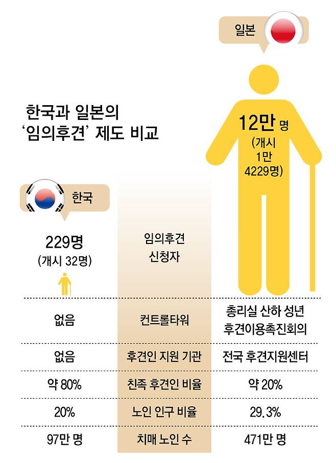 치매로 기억을 잃기 전, 내 자산을 지켜줄 ‘후견인’을 미리 지정한 일본과 한국 노인의 숫자다. 치매 노인 인구는 각각 471만 명과 97만 명으로 4.9배인데, 건강할 때 후견인을 정하는 ‘임의후견’ 이용자는 500배 이상 차이가 나는 것이다. 이 극명한 격차 사이로 한국 치매 노인이 평생 모은 돈은 증발하고 있다.