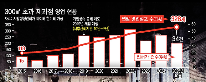 시설 면적 300㎡ 이상 제과점 영업 인허가 건수는 2015∼2018년 사이 연간 10∼19개, 연평균 15.3개에 그쳤다. 그러던 것이 2019년 들어 4분기에만 17개가 늘어나며 그해 44개 증가했다. 2022년 53개가 늘어나는 등 2020∼2024년 사이 5년간은 연평균 44.4개씩 증가했다. 올해도 10월 말까지 34개가 늘어났다. 2019년 이후 새로 인허가를 받은 업소는 모두 300개로, 2018년 말 영업 중이던 154개의 갑절에 이르렀다.