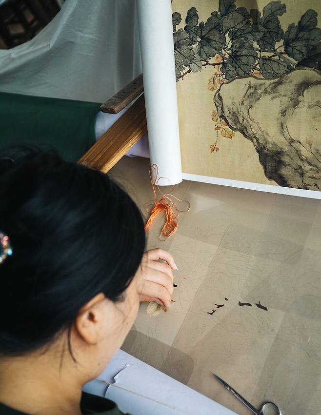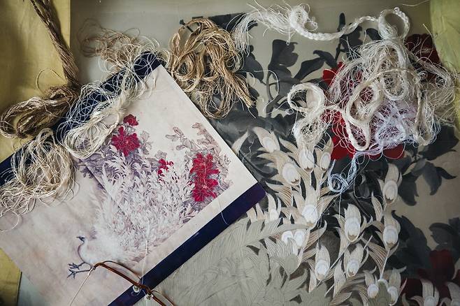 전시실을 거닐다 보면 시선은 자연스레 디테일에 빨려 들어간다. 털 한 올, 깃털 한 가닥을 실로 재현하는 초세밀 자수는 아름답다기보다는 집요하다는 표현이 더 적합하다. 이미지가 사실적인 이유는 미감 때문이 아니라, 장인들이 수십 년 동안 축적한 기량의 결과이기 때문이다. 또 하나 흥미로운 요소는 실물 작품만큼이나 중요한 작업실 공간이다. 이곳에서는 장인들이 실제 작업을 이어가는 모습을 볼 수 있다.