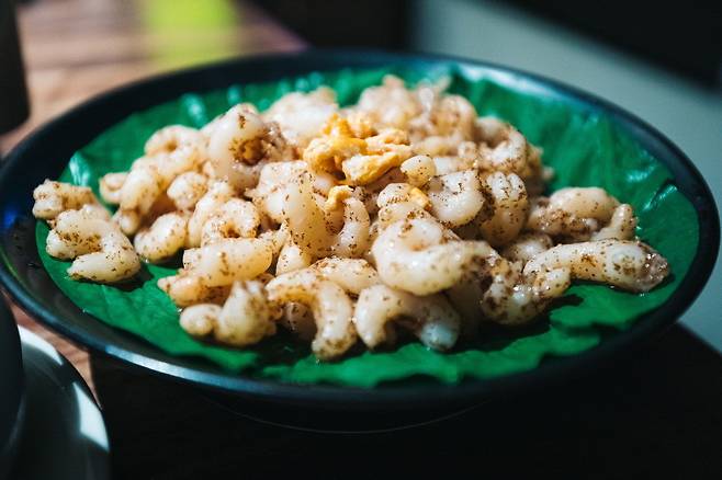 이곳의 대표 메뉴는 쑤저우식 국수. 쑤저우식 국수는 얇은 면을 사용해 담백한 맛을 내는 것이 특징이다. 얇고 조금은 딱딱하게 느껴질 정도로만 익힌 면, 그 위에 올라간 생강, 그리고 간장과 참기름, 적초가 아주 적당히 섞인 소스. 면을 먼저 소스에 비비고 나서, 그 위에 민물 새우 고명을 얹는다. 민물새우는 바다 새우보다 훨씬 식감이 부드럽다.