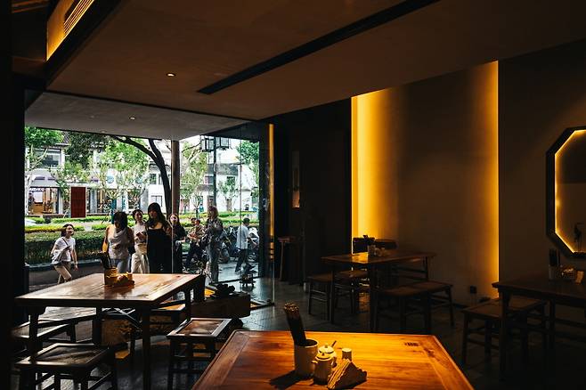 고소교면관은 쑤저우식 국수를 만나볼 수 있는 레스토랑이다. 건물 구조부터 쑤저우 고유의 정원을 압축한 듯한 모습이다. 흰 벽과 어두운 목재의 대비, 작은 마당과 정원 요소, 고풍스러운 실내 배치는 의도적으로 여백을 만들어놨다.