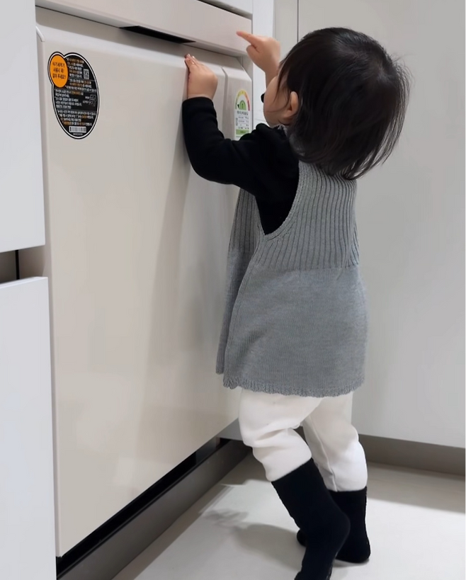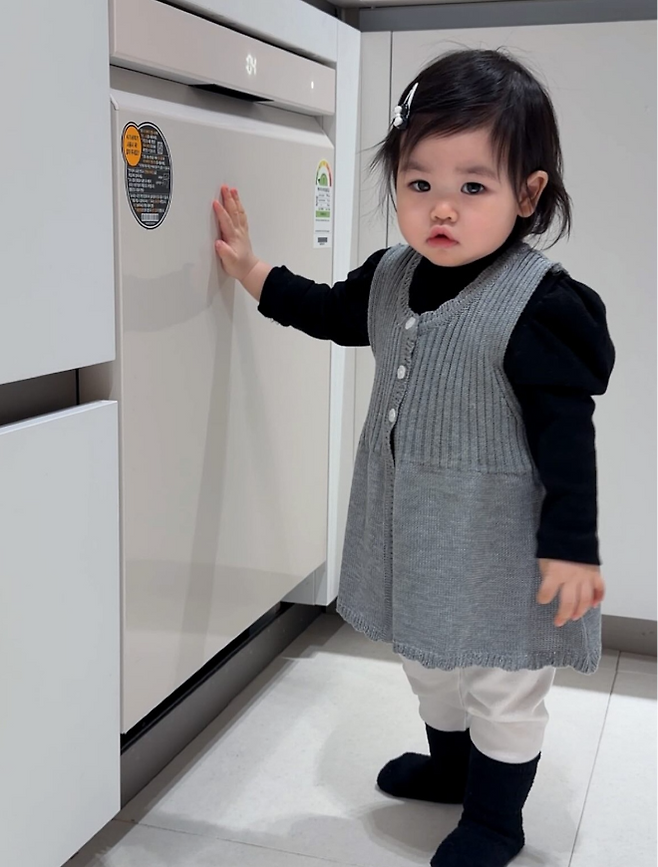 사진 속 재이는 식기세척기 앞에 서서 문을 짚거나 상단을 올려다보는 모습이다. 아직 14개월에 불과하지만, 호기심 가득한 눈빛과 당당한 자세는 마치 집 안을 점검하는 ‘주인공’처럼 보인다. 작은 손으로 가전제품을 짚고 선 장면은 자연스럽게 시선을 끌었다.